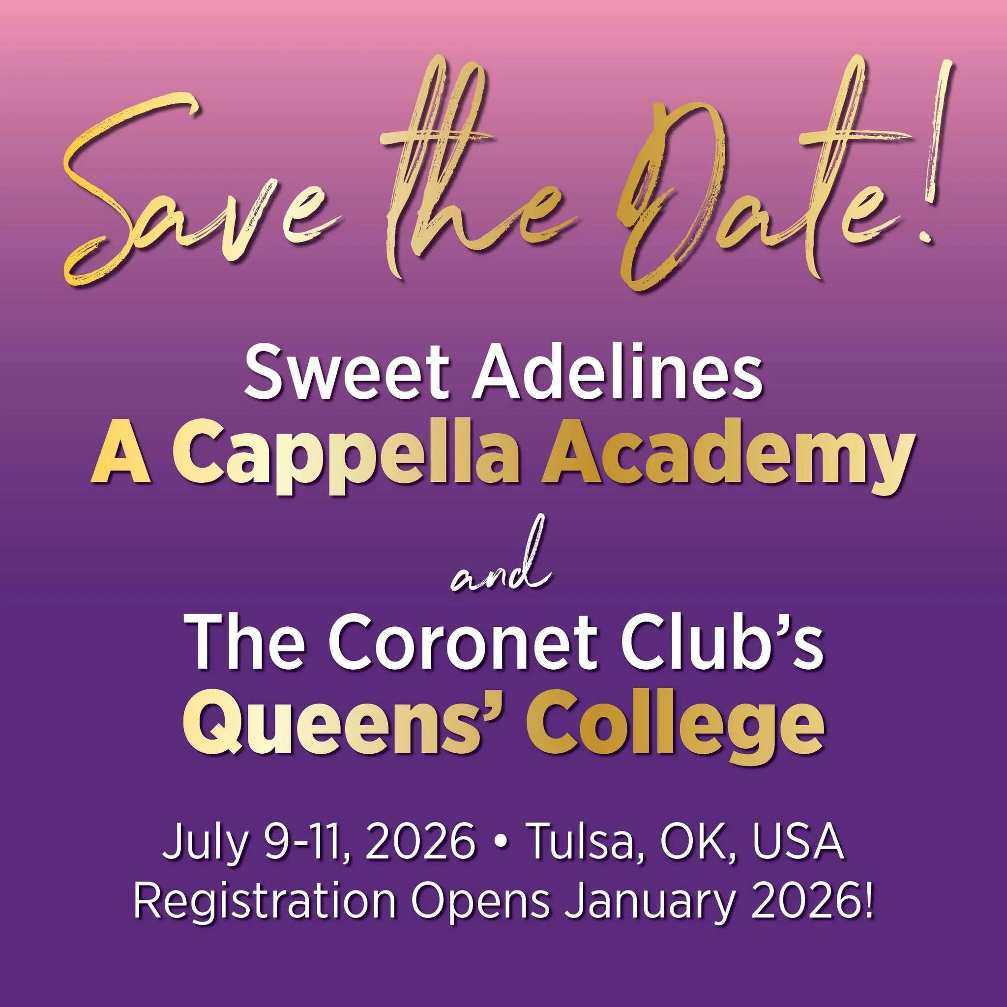 We are unbelievably excited to participate in our very first Queen’s College! Join us and so many other incredible performers this summer! Save the date for Sweet Adeline’s A Cappella Academy and Queen’s College with The Coronet Club, happening July 9th - 11th, 2026 in Tulsa, OK!
